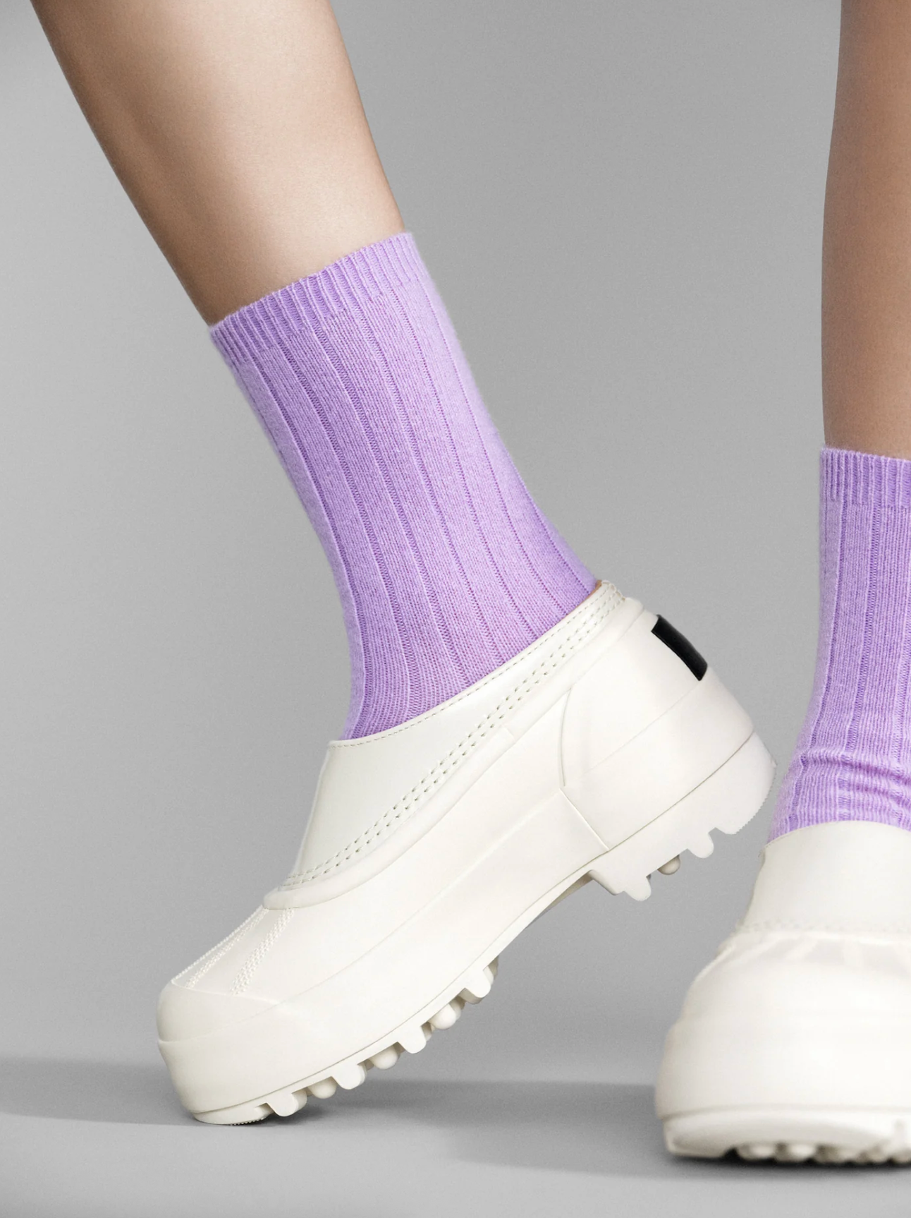 Italia Cashmere Cozy Rib Crew Socks in Lilac from Hansel from Basel. Made of 80% Italian recycled cashmere, don't be fooled by the simplicity of these crews, your feet will thank you! Made in Portugal at a small family-run factory that operates entirely on renewable energy.