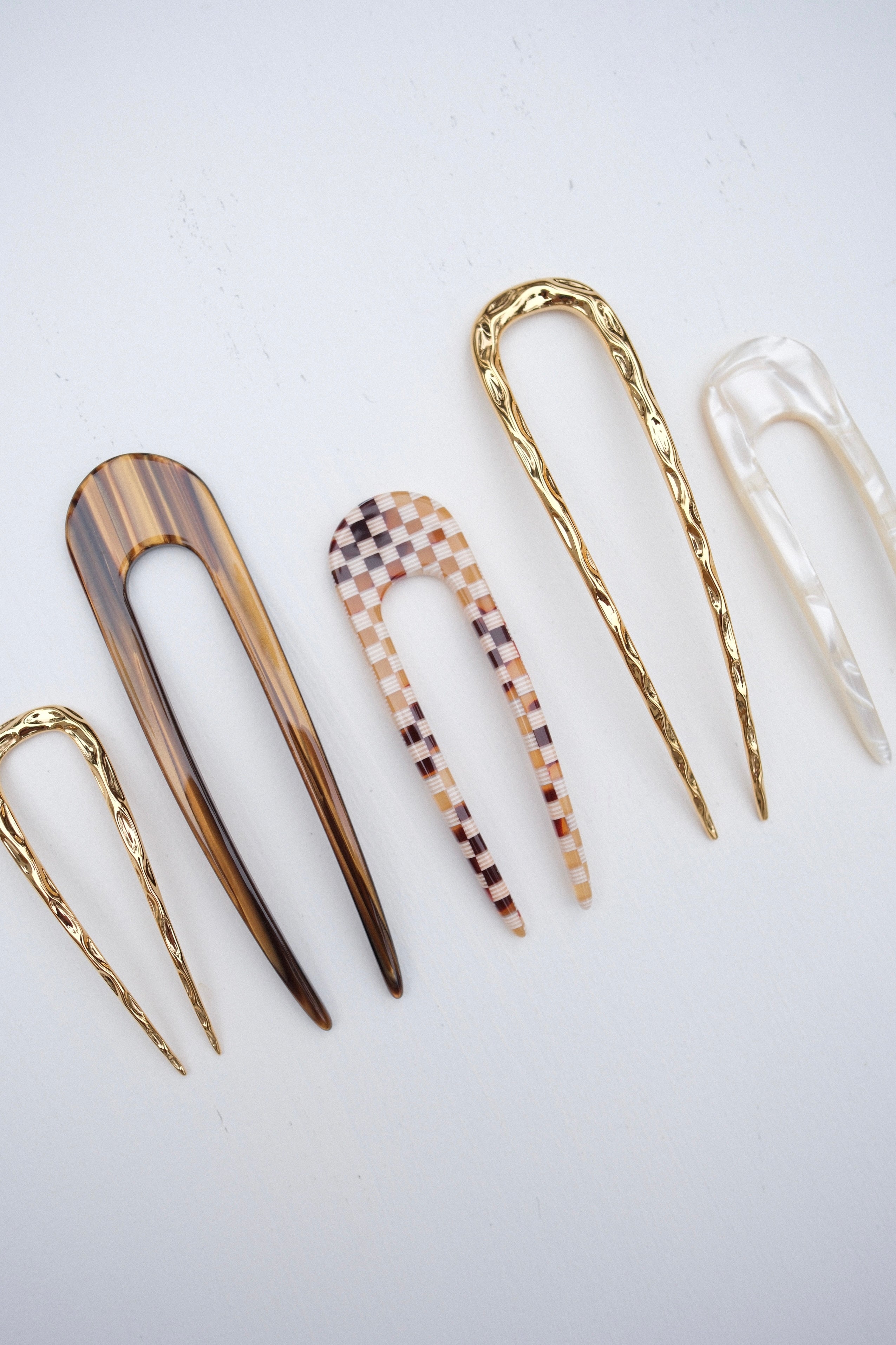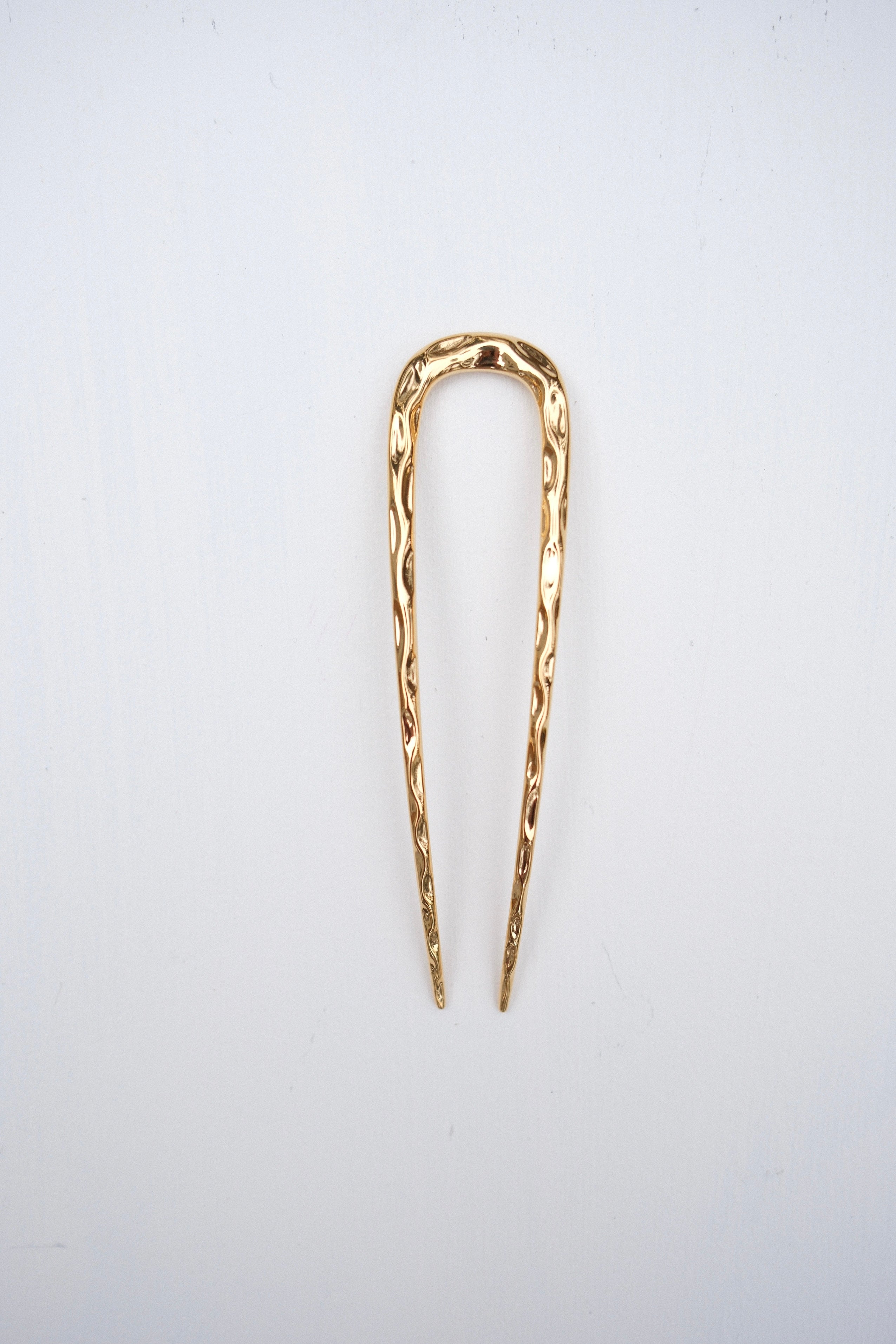 Wavy French Hair Pin in Gold from Machete. A wavy textured hair pin designed to securely yet gently hold hair. Handcrafted with a gold plated finish.